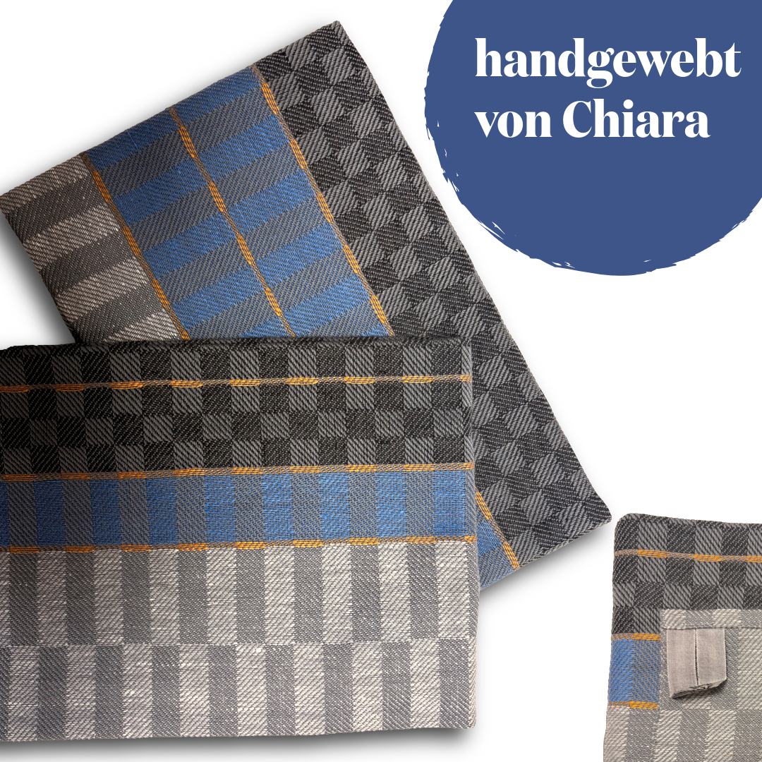Unser ganz besonderes Geschirrtuch für alle Ruhrpott-Liebhaber; handgewebt von Chiara aus unserer Web- und Nähstube. Das einzigartige Design kombiniert das traditionelle Karomuster des Grubentuchs in Schwarz/Grau mit orangenen und blauen Farbelementen. Eine Besonderheit für die Küche in bewährter Halbleinen-Qualität für eine sehr gute Feuchtigkeitsaufnahme.