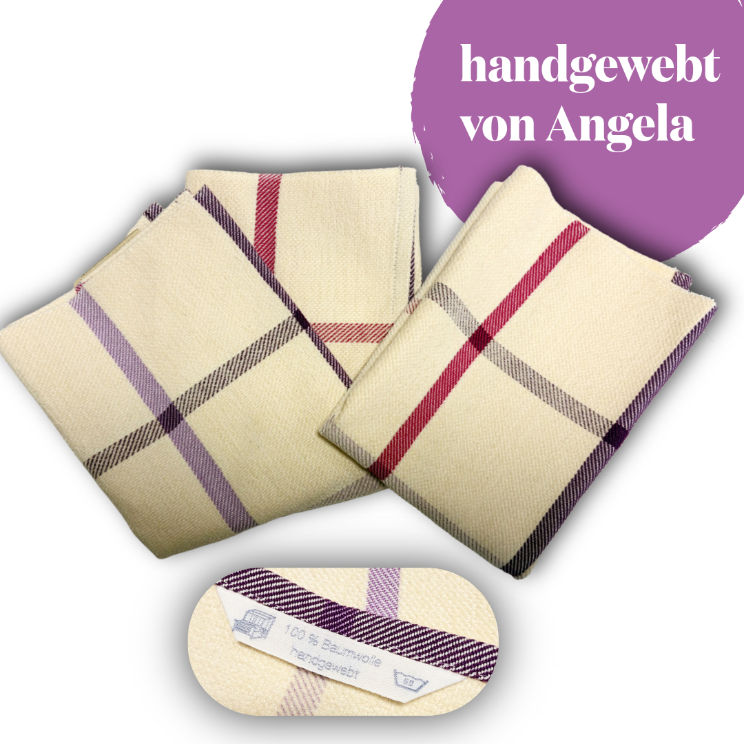 Dieses edle Küchen- oder Gästehandtuch wurde von Angela aus unserer Web- und Nähstube handgewebt. Besonders weich und saugfähig wird es durch das bauschige Chenille-Garn. Ein dezentes Karomuster in rot/violett auf weißem Hintergrund macht das Handtuch zu einem echten Hingucker für Küche oder Bad.