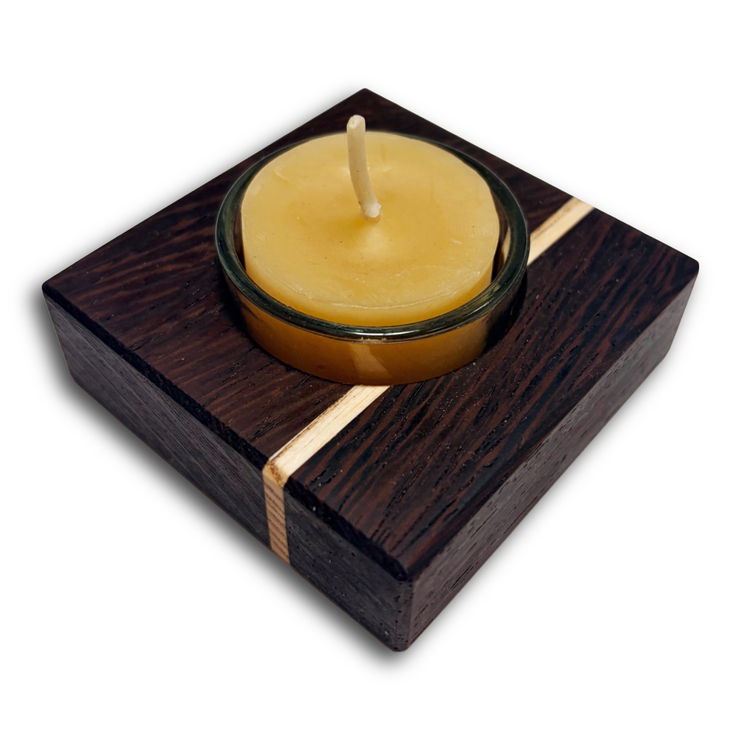 Ein besonderer Hingucker - unser handgearbeiteter Teelichthalter aus edlem Wengeholz, verziert mit einer Lisene aus Eschenholz. Eine Zusammenarbeit unserer Holzwerkstatt und Kerzenwerkstatt in Bochum. Inklusive Teelichtglas mit handgegossenem Teelicht aus duftendem Bienenwachs.